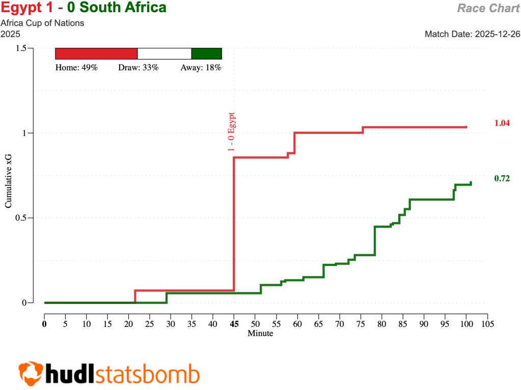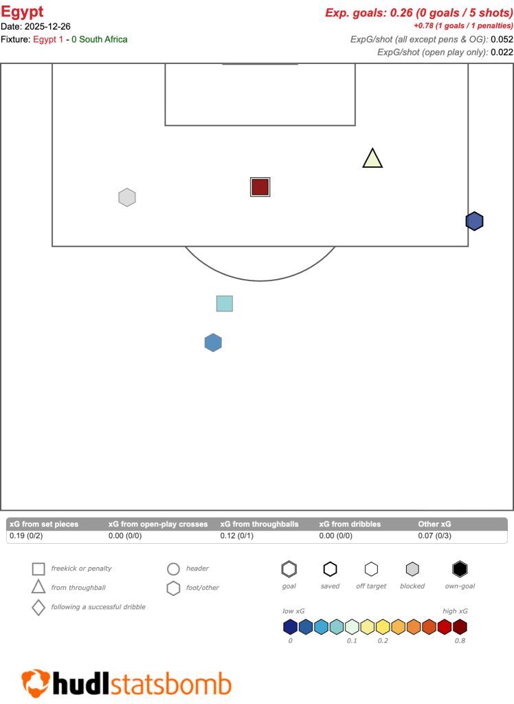 More worryingly, the Pharaohs produced a dismal attacking display, salvaged only by a very generous penalty won and converted by Mo Salah. Across the entire match, Egypt registered just five non-penalty shots, only two of them from inside the box, for a total of 0.26 xG. The numbers speak for themselves.