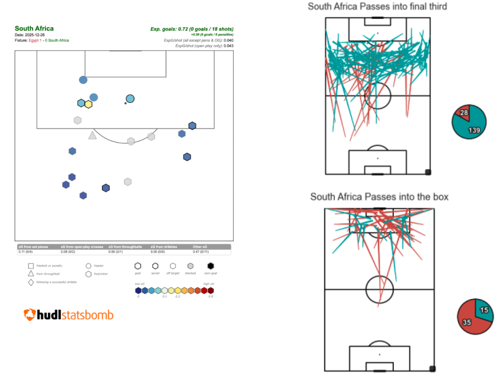 On the positive side for Hossam Hassan’s men, Egypt once again showed they can rely on a solid defensive foundation. South Africa were limited to just one shot in the first half and resorted to low-value, speculative efforts after the break.